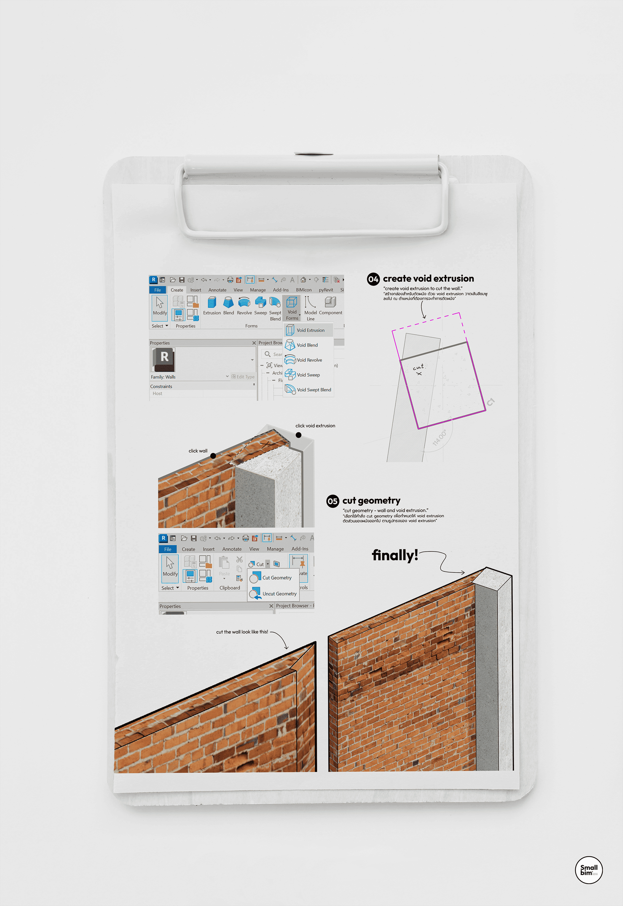 คลิกคำสั่ง Cut Geometry แล้วเลือก Void Extrusion แล้วไปเลือก ผนังครับ เป็นอันเสร็จสิ้น การตัดผนังเรียบร้อยแล้ว
